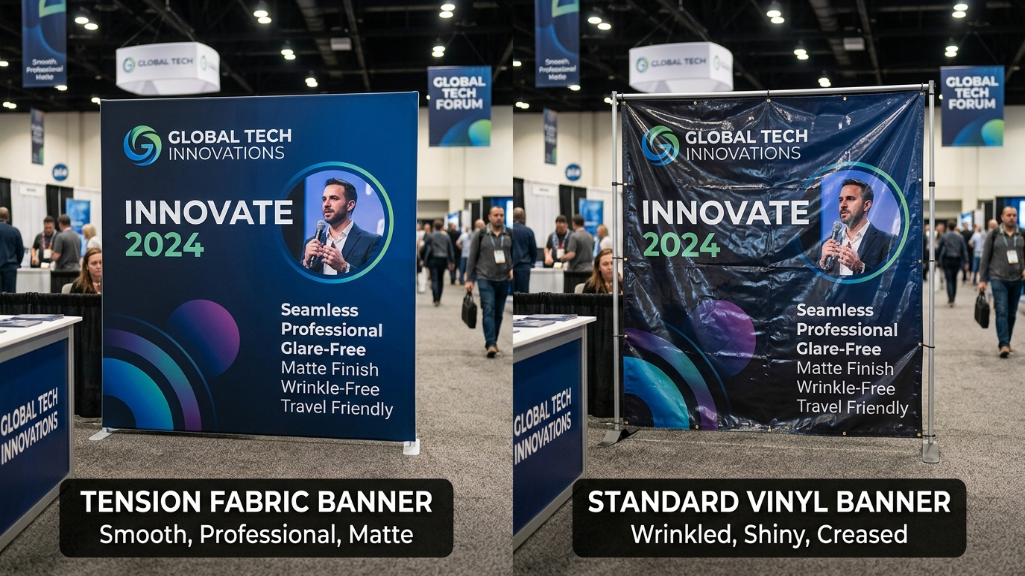 You’ve seen it before: a company spends thousands on a trade show booth, only to hang a vinyl banner that looks like a crumpled receipt. Flash photography hits the shiny surface, ruining media shots. Edges curl, and it takes two people 20 minutes just to install.